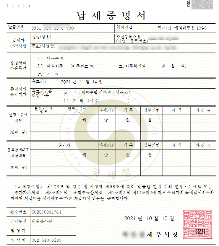쉽게 말해, 국가에 납부해야 할 세금(부가세, 종소세 등)을 모두 냈다는 걸 증명하는 문서죠.