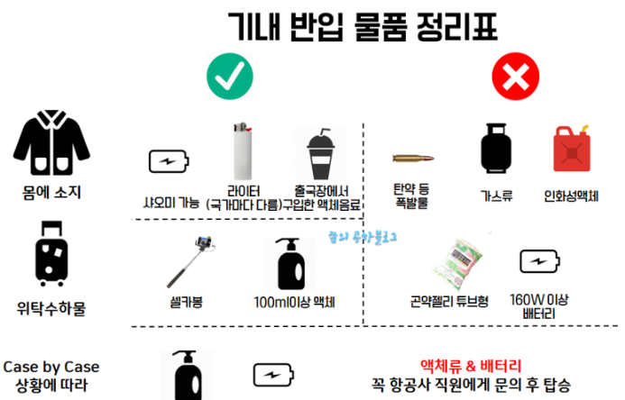 - 보조배터리 – 위탁 불가, 기내 수하물로만 소지